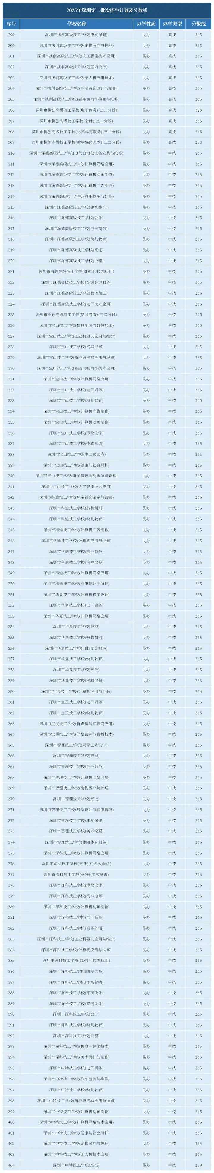 ▍民办中职/技校:分数线普遍较低,大部分专业执行265分的最低控制线,少数专业在280-320分之间。