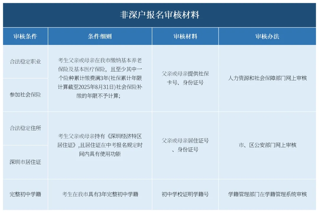 非深户考生特别注意:如不符合相关报名要求,将无法参与中考志愿的划线录取,即使学业成绩再优秀,也无法被公办高中录取。建议不符合条件的考生家长尽早考虑回户籍所在地参加中考或办理深圳户籍。