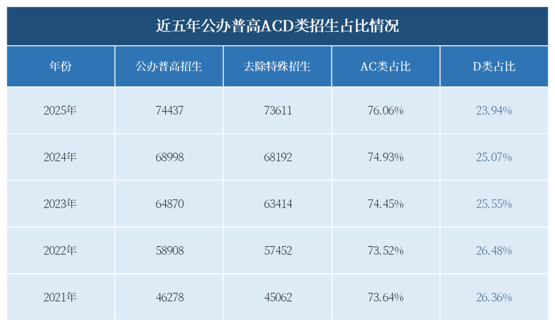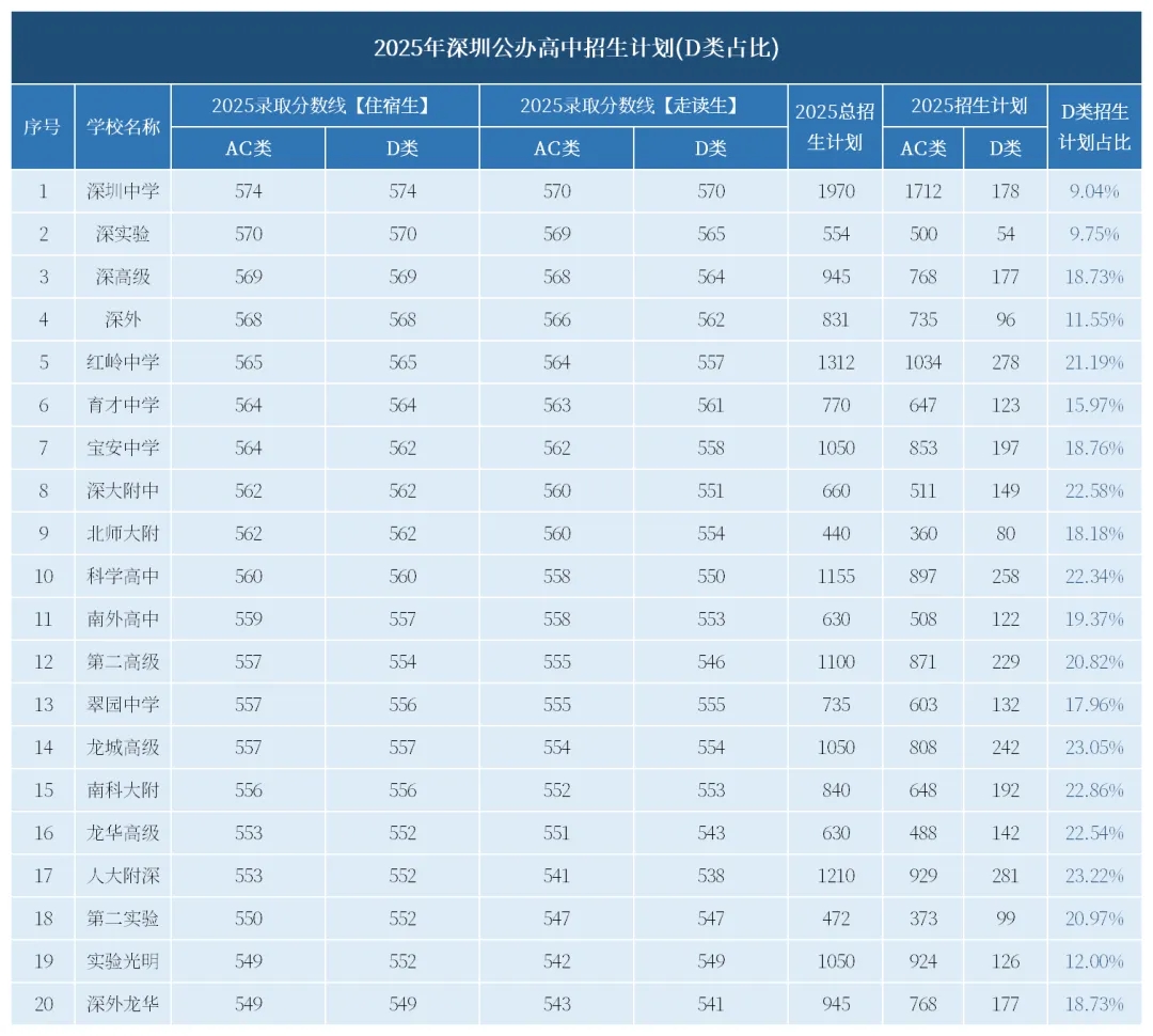 2025年,全市公办普高学位中,仅有23.94%面向非深户考生,而AC类(深户)考生则占据了76%的份额。这意味着,在学位争夺上,D类考生的基础竞争池更小。