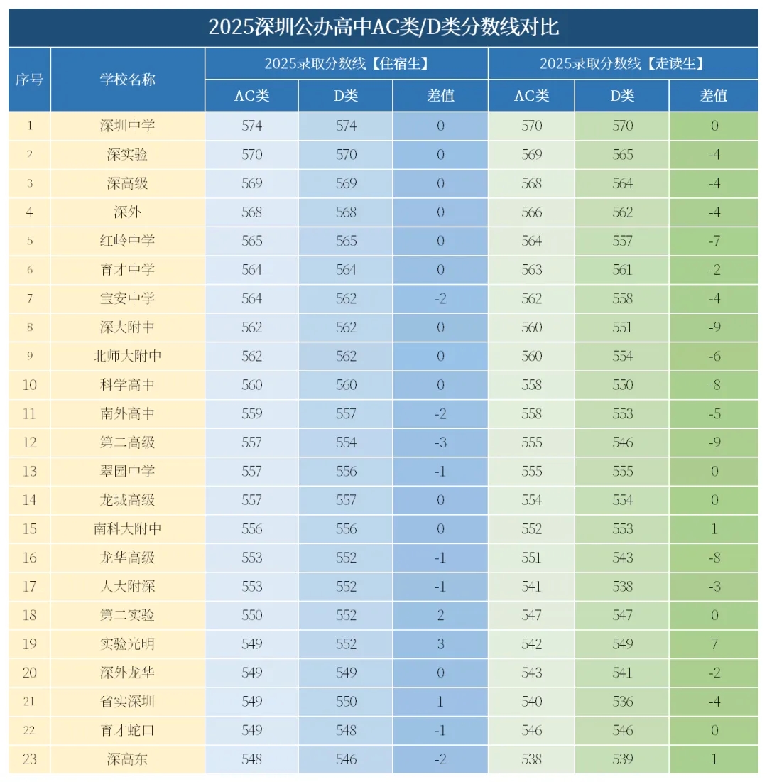 真相:竞争格局出现关键“弹性”。“走读生”成为重要变量。以2025年数据为例,红岭中学住宿生分数线(AC/D类均为565),但走读生分数线D类(557)比AC类(564)低了7分。