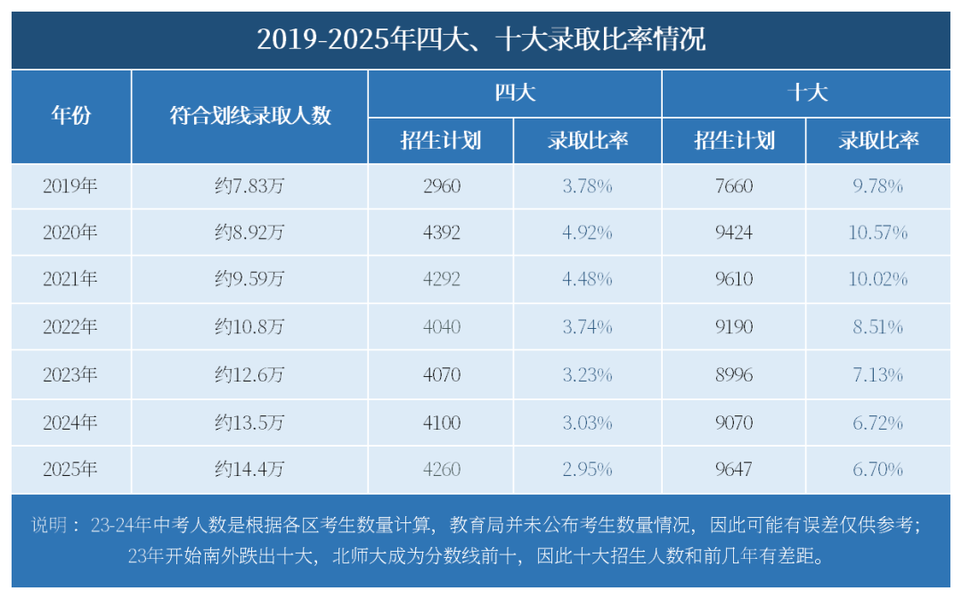 无论对哪类考生,“上名校”都越来越难。2019年至2025年,虽然四大、十大的招生计划数略有增减,但由于中考总人数持续攀升,实际录取率连年下降。